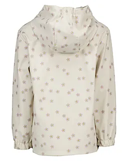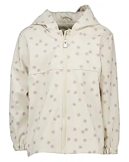 Deze beige regenjas voor jongens en meisjes heeft een all-over patroon met kleine bloemen. De jas sluit met een rits aan de voorkant en heeft een vaste capuchon, zodat je hoofd goed droog blijft bij regen. De lange mouwen sluiten met elastiek bij de polsen, waardoor regen minder snel naar binnen komt. Gemaakt van een stevige, geweven stof.