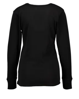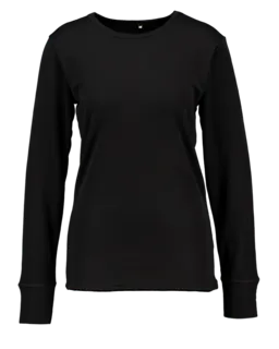 Dit zwarte dames T-shirt met lange mouwen en ronde hals is gemaakt van deels gerecycled polyester. De stevige stof voelt comfortabel aan en blijft mooi in vorm. Door de ribstructuur en thermo-eigenschappen sluit het shirt goed aan en helpt het om je warm te houden op koude dagen.