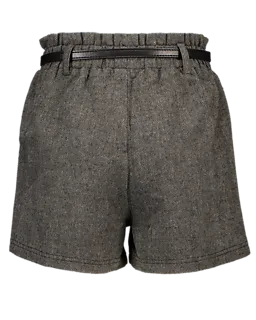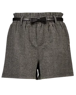 Deze zwarte korte broek voor meisjes heeft een elastische tailleband met een subtiel ruche-effect. De smalle, afneembare riem met strik zorgt ervoor dat de broek goed blijft zitten. De stof heeft een licht gemêleerde uitstraling. De rechte, losse broekspijpen bieden extra comfort. Ideaal voor dagelijks gebruik en makkelijk te combineren met verschillende tops.