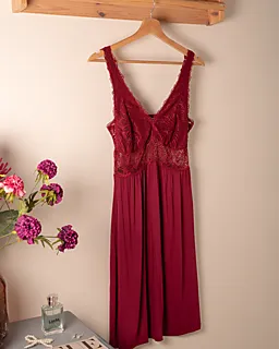 Dit dames nachthemd met kant is gemaakt van een zachte stofmix van viscose en elastaan. Het bordeauxrode model heeft kant langs het bovenstuk en de schouderbanden. In de taille zit een transparant kanten detail. Door de soepele stof voelt de jurk prettig aan en geeft hij veel comfort tijdens het slapen.