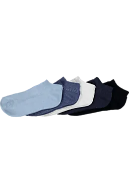 Deze set sneakersokken bestaat uit vijf paar in lichtblauw, blauw, wit, donkerblauw en zwart. Ze zijn gemaakt van polyester, katoen, viscose en een beetje elastaan, waardoor ze zacht aanvoelen en licht meerekken. Door de lage pasvorm draag je ze prettig in je sneakers, zodat ze nauwelijks zichtbaar zijn tijdens het lopen.