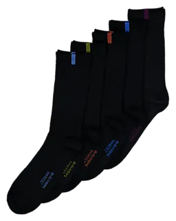 Deze set van vijf zwarte sokken is gemaakt van viscose bamboe, gerecycled polyester en een beetje elastaan. Elke sok heeft een subtiel gekleurde markering bij de boord en op de zool, zodat je de sokken makkelijk uit elkaar houdt. De zachte en rekbare stof voelt prettig aan, waardoor de sokken comfortabel zitten tijdens het dragen.