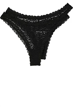 Deze set bestaat uit twee zwarte damesstrings die gemaakt zijn van een rekbare stof met een kanten structuur. De brede, elastische tailleband zorgt ervoor dat de string prettig meerekt en comfortabel blijft zitten. Dankzij het kanten materiaal heeft de string een luchtige uitstraling en voelt hij licht aan op de huid.