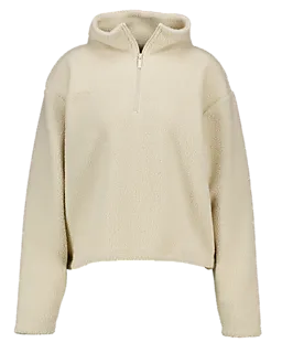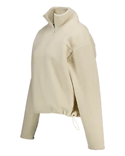Sweater voor dames in beige kleur, gemaakt van 100% polyester. De stof heeft een zachte, fleece-achtige uitstraling. Voorzien van een opstaande kraag met korte rits aan de voorkant. De sweater heeft lange mouwen en een rechte, wat bredere pasvorm. Afwerking zonder zichtbare boorden aan de onderkant en mouwen. Geschikt om warm te blijven op koudere dagen.