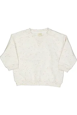 Deze beige sweater heeft een lichte kleur met kleine gekleurde spikkels. De ronde hals en lange mouwen zorgen voor extra comfort. De boorden bij de mouwen en onderkant sluiten goed aan, zodat de sweater netjes blijft zitten. Dankzij de zachte, soepele stof voelt hij prettig aan, waardoor je hem makkelijk over een romper of T-shirt aantrekt.