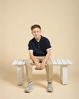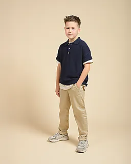 Dit donkerblauwe jongensshirt heeft korte mouwen en een klassieke kraag met drie knopen, waardoor je het makkelijk aan- en uittrekt en het prettig draagt. De gebreide stof voelt stevig en comfortabel. De effen kleur houdt het ontwerp rustig, zodat je het shirt eenvoudig combineert met een broek of short voor elke dag.