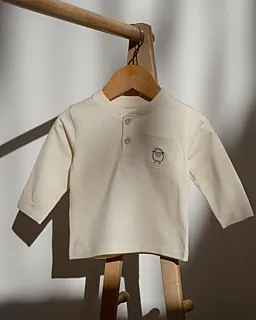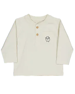 Deze beige unisex baby T-shirt heeft lange mouwen en is gemaakt van single jersey. Op de borst zit een opgestikt zakje met een klein, getekend schaapje als detail. De hals heeft een ronde vorm en is afgewerkt met twee houten knoopjes, wat het aan- en uittrekken gemakkelijk maakt. De neutrale kleur past bij verschillende outfits en is geschikt voor zowel jongens als meisjes.