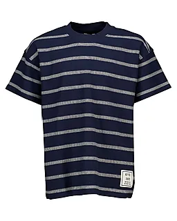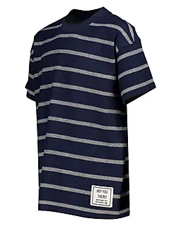 Dit donkerblauwe jongens T-shirt heeft grijze strepen over het hele oppervlak, waardoor het een rustige en stoere uitstraling krijgt. De ronde hals en korte mouwen geven je veel bewegingsvrijheid, zodat het fijn zit op warme dagen. Onderaan zit een klein label dat voor een nette, eenvoudige afwerking zorgt zonder op te vallen.