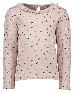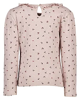 Dit paarse meisjes T-shirt heeft lange mouwen, een ronde hals en een subtiel patroon. De kraag heeft een kleine rucherand, wat een verzorgde en nette uitstraling geeft. Achter zit een knoopsluiting, zodat je het T-shirt makkelijk aantrekt. De soepele stof voelt prettig op je huid en ademt goed, wat dit shirt ook geschikt maakt voor de warmere dagen van het jaar.