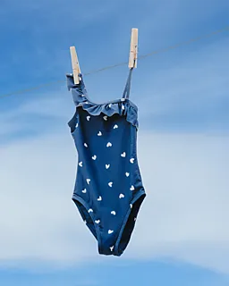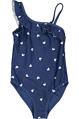 Dit meisjesbadpak is donkerblauw met kleine witte hartjes. De asymmetrische schouder heeft aan één kant een smalle band en aan de andere kant een brede ruffle, waardoor je een speelse look krijgt. De gladde stof met voering voelt prettig aan, zodat je vrij kunt bewegen tijdens het zwemmen. Dankzij de aansluitende vorm blijft het badpak goed op zijn plek.