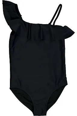 Dit zwarte meisjesbadpak heeft een asymmetrisch model met één schouderband en een brede rucherand, waardoor het speels oogt en prettig blijft zitten. De gladde stof met polyamide en elastaan rekt soepel mee, zodat je vrij beweegt tijdens het zwemmen. De voering van polyester voelt zacht aan, waardoor het badpak extra comfortabel is.