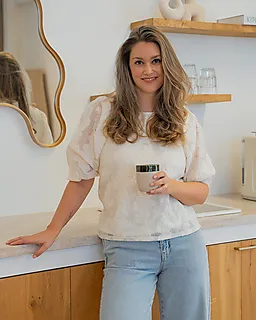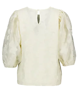 Deze beige damesblouse heeft driekwart mouwen met een lichte ballonvorm en een ronde hals, waardoor hij prettig zit. De jacquardstof geeft een subtiel dessin, zodat de blouse een rustige uitstraling heeft. Door de effen kleur combineer je deze blouse eenvoudig met een broek of rok. De sluiting op de rug maakt aan- en uittrekken makkelijk.