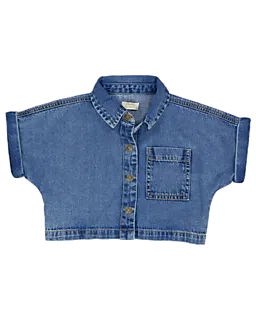 Deze blauwe meisjesblouse is gemaakt van stevige denim, waardoor hij comfortabel zit en goed blijft zitten tijdens het dragen. De blouse heeft korte mouwen en een knoopsluiting aan de voorkant, zodat je hem makkelijk aan- en uittrekt. Op de borst zit een opgestikt zakje, wat zorgt voor een speels detail. Door het cropped model draag je deze blouse eenvoudig casual.