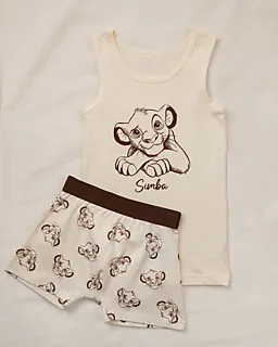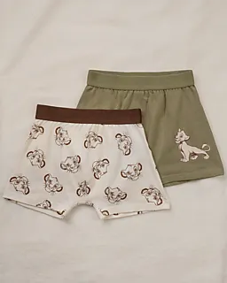 Deze set bestaat uit twee jongensboxers. Eén boxer is beige met een all-over The Lion King print en een donkerbruine tailleband, de andere is effen olijfgroen. De elastische tailleband zorgt ervoor dat beide boxers goed blijven zitten, zodat je ze makkelijk aantrekt. Dankzij de zachte single jersey stof voelen ze prettig aan op je huid.