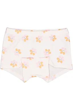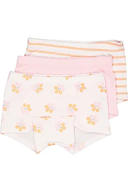 Deze set van drie meisjesboxers heeft zachte kleuren met een vrolijk dessin. Eén boxer is gestreept in roze en wit, één is effen roze en één heeft een bloemenprint in geel en roze. De soepele stof met katoen, polyester en elastaan voelt prettig aan en rekt licht mee, zodat de boxers comfortabel aansluiten. De elastische tailleband zorgt ervoor dat ze goed blijven zitten.
