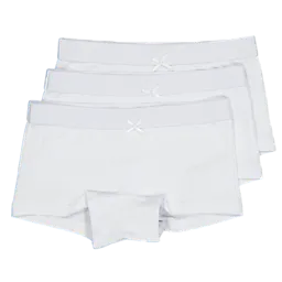 Deze witte boxers voor jongens en meisjes komen in een set van drie. De zachte katoenmix met een beetje elastaan voelt prettig aan, waardoor de stof licht meerekt en goed aansluit. De elastische tailleband geeft steun, zodat de boxers de hele dag comfortabel zitten. Voorop zit een klein strikje voor een eenvoudige en nette uitstraling.