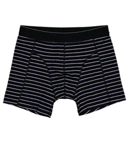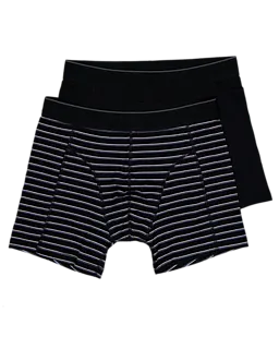 Deze zwarte boxershorts voor heren zijn extra lang en gemaakt van katoen met een beetje elastaan, wat zorgt voor een stevige en comfortabele pasvorm. Eén boxer is effen zwart, de ander heeft een patroon van dunne zwarte strepen. De langere pijpen bieden extra bedekking en comfort tijdens het dragen.