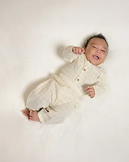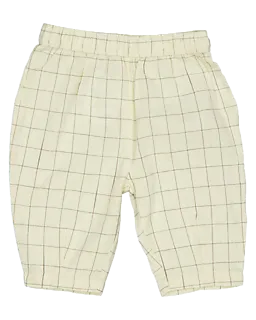 Deze beige babybroek heeft een ruitpatroon en een elastische tailleband die goed mee rekt. Zo trek je het broekje makkelijk aan en blijft het prettig zitten. De rechte pijpen zorgen ervoor dat je baby lekker vrij kan bewegen. Door de lichte kleur en het rustige patroon combineer je deze broek eenvoudig met andere kleertjes.