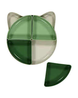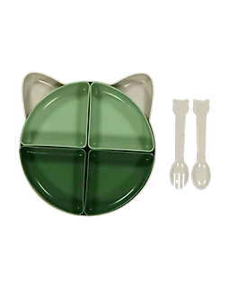 Deze eetset bestaat uit een rond bord met vier aparte vakken en oortjes aan de rand, in licht beige en donkergroen. Het bord is gemaakt van stevig polypropeen, waardoor het prettig in de hand ligt en makkelijk schoon te maken is. Je krijgt er een lepel en vork bij in dezelfde kleur. Dankzij de indeling blijft het eten goed gescheiden, zodat je eenvoudig verschillende gerechtjes kunt serveren.