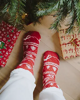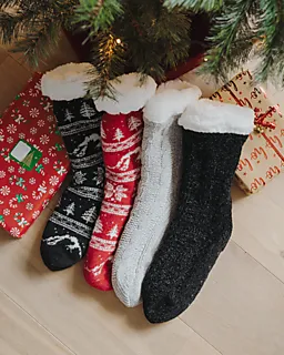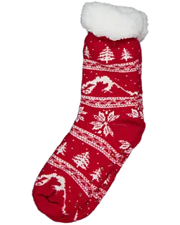 Huissokken voor dames gemaakt van 100% polyester. Deze rode sokken hebben een winterse print van bomen, rendieren en sneeuwvlokken en zijn voorzien van een zachte, witte omslag aan de bovenkant. De warme en zachte stof houdt je voeten comfortabel binnenshuis. Door de stevige afwerking blijven de sokken prettig zitten tijdens het lopen in huis.