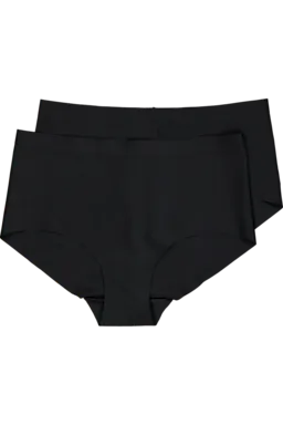 Deze set bestaat uit twee effen zwarte Isa hipsters voor dames die gemaakt is van een gladde stof die onzichtbaar is onder je kleding. De zachte afwerking zorgt ervoor dat de randen netjes aansluiten, zodat je geen lijnen ziet. Dankzij de elastische tailleband blijft de hipster goed zitten, ook als je beweegt.