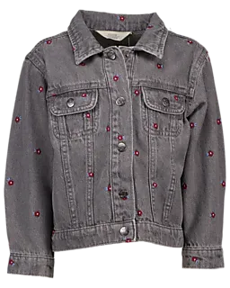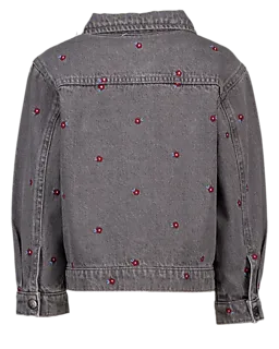 Deze grijze jas is gemaakt van 100% katoen en heeft een denim uitstraling. De jas is afgewerkt met metalen knopen aan de voorkant en op de borstzakken. Over het hele oppervlak zijn kleine rode bloemetjes geborduurd, wat zorgt voor een speels accent. De jas heeft lange mouwen en is geschikt om makkelijk open of dicht te dragen, afhankelijk van het weer.