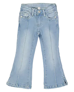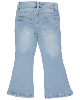 Deze blauwe meisjesjeans is gemaakt van denim met katoen en een beetje elastaan, waardoor de stof licht meerekt en prettig zit als je beweegt. De broek heeft wijd uitlopende pijpen en een lichte wassing, wat zorgt voor een speelse uitstraling. Dankzij de stevige stof voelt de jeans comfortabel aan en blijft hij goed in model tijdens het dragen.