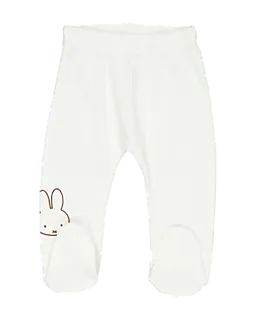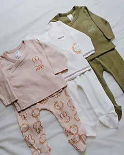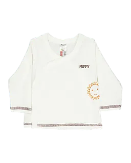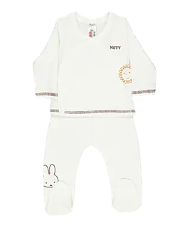 Deze witte babyset bestaat uit een truitje met lange mouwen en een broekje met voetjes. Op het truitje staat Miffy samen met een zonnetje, en het broekje heeft een dessin met een konijntje op het been. De zachte stof en de comfortabele pasvorm zorgen ervoor dat je je makkelijk kunt bewegen, zodat deze set fijn zit voor baby's.