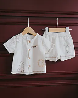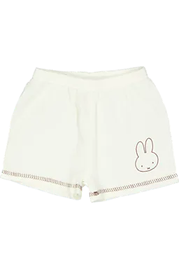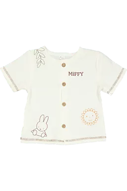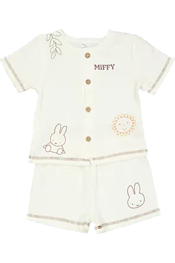 Deze witte babykledingset bestaat uit een shirt met korte mouwen en een bijpassend broekje. Op het shirt staan de naam MIFFY en zachte prints van nijntje en een zonnetje, waardoor het geheel een speelse uitstraling krijgt. De knoopjes aan de voorkant maken het aan- en uittrekken makkelijk. Het broekje heeft een elastische tailleband, zodat het prettig en comfortabel zit.