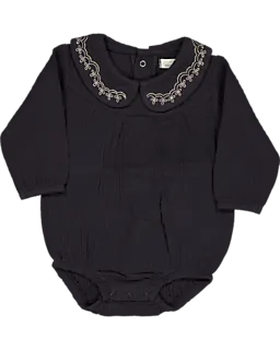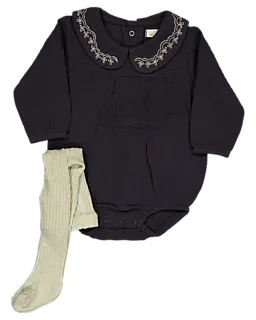 Deze zwarte set voor baby's bestaat uit een romper met lange mouwen en een ronde hals, afgewerkt met een geborduurde rand. De romper sluit onderaan met drukknoopjes, wat het verschonen makkelijk maakt. Er wordt een paar lichte, lange sokken meegeleverd. Het praktische ontwerp zorgt ervoor dat je baby comfortabel zit en alles goed blijft zitten tijdens het dragen.