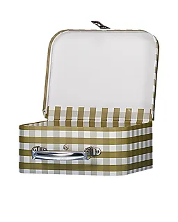 Deze koffer heeft een blokjespatroon in verschillende kleuren en een metalen handgreep. Door de stevige kartonnen constructie is de koffer licht, waardoor je hem gemakkelijk mee kunt nemen. Het handige formaat en het klepdeksel zorgen ervoor dat je kleine spullen eenvoudig opbergt. Zo blijft alles netjes op één plek, bijvoorbeeld voor speelgoed of knutselspullen in huis.