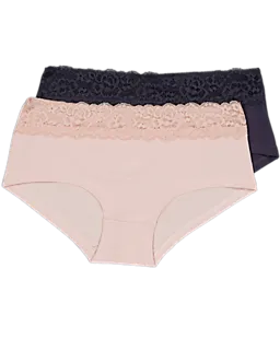 Deze Linda hipster voor dames is roze en wordt geleverd per set van twee stuks. De hipsters bestaan uit 95% katoen en 5% elastaan, waardoor de stof zacht aanvoelt en licht meerekt. De brede kanten rand aan de bovenkant sluit goed aan, zodat je een comfortabele pasvorm hebt onder je kleding.