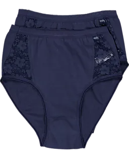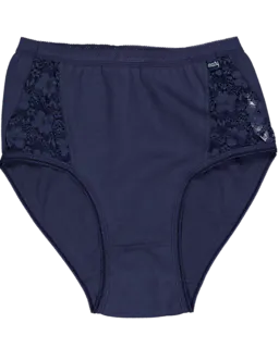 Deze Mady tailleslips voor dames zijn donkerblauw en hebben kanten details aan de zijkanten, waardoor het model een vrouwelijke uitstraling krijgt. Dankzij het zachte katoen met een beetje elastaan voelt de stof prettig aan en rekt licht mee, zodat je comfortabel kunt bewegen. De hoge taille zorgt ervoor dat de slip goed aansluit rond je buik en heupen.