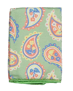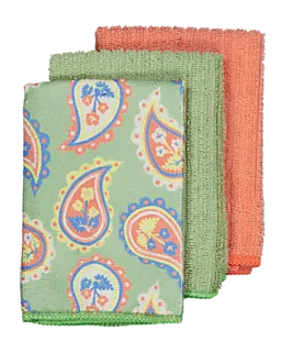 Deze set bestaat uit drie microvezeldoeken in groen en oranje. Eén doek heeft een paisleyprint in groen, oranje en blauw. De doeken zijn gemaakt van polyester, waardoor ze licht en zacht zijn. Dankzij het materiaal nemen ze gemakkelijk stof en vuil op. Zo maak je snel en eenvoudig schoon in huis.