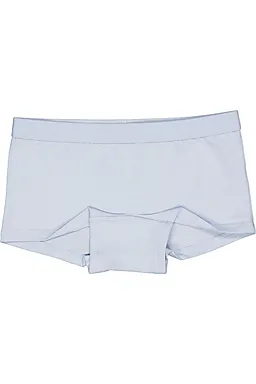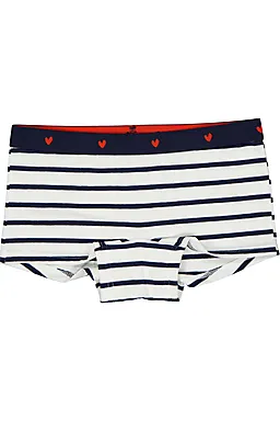 Set Nancy boxers voor meisjes, één boxer is effen lichtblauw en de ander heeft donkerblauw met witte strepen met een donkerblauwe, elastische tailleband met kleine rode hartjes. Door de elastische tailleband blijven de boxers goed zitten. Het katoen met een beetje elastaan voelt zacht aan en rekt licht mee, zodat je comfortabel beweegt.