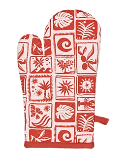 Deze ovenwant heeft een rood-witte print met verschillende grafische motieven. De buitenkant is van katoen, de vulling van polyester en de voering van polypropeen. Hierdoor voelt de want stevig aan. Met een formaat van 17 bij 29 centimeter bescherm je je handen goed als je warme schalen uit de oven haalt. Dankzij het ophanglusje hang je de want makkelijk op in de keuken.