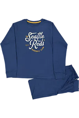Deze blauwe jongenspyjama heeft een shirt met lange mouwen en een lange broek. Op het shirt staat ‘Seattle Reds Baseball Club’ in wit en geel. De katoenen stof voelt zacht aan, waardoor de pyjama prettig draagt op je huid. De ronde hals zit comfortabel, zodat je makkelijk beweegt tijdens het slapen.