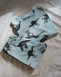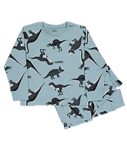Deze blauwe pyjama voor jongens is gemaakt van 100% katoen. De set bestaat uit een longsleeve shirt en een lange broek met grote, zwarte dinosaurussen. De zachte katoenen stof voelt prettig aan op de huid, waardoor je kind comfortabel kan slapen of ontspannen. De speelse print maakt deze pyjama extra leuk om te dragen.