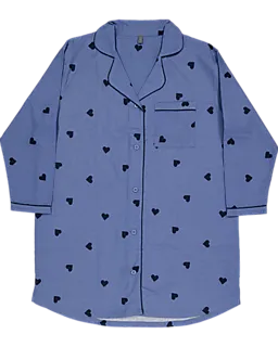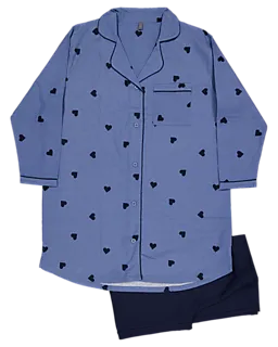 Deze flanellen damespyjama bestaat uit een blouse met knoopsluiting, borstzakje en kraag en een lange broek. De blouse is jeansblauw met kleine hartjes en gemaakt van 100% katoen. De donkerblauwe pyjamabroek heeft wat elastaan waardoor hij goed met je lichaam mee beweegt.