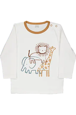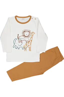 Deze bruine babypyjama bestaat uit een witte top met een vrolijke print van een leeuw, giraffe en olifant. De lange mouwen en zachte stof zorgen ervoor dat je het warm hebt. De drukknoopjes op de schouder maken het aan- en uittrekken makkelijk.