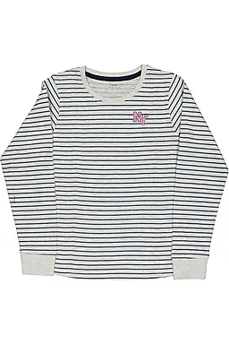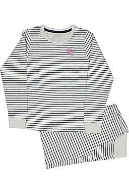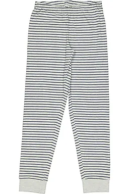 Deze meisjespyjama heeft een grijs‑wit gestreept shirt met lange mouwen en een ronde hals, zodat het prettig aansluit. De lange broek heeft dezelfde strepen, waardoor het geheel rustig oogt. De zachte singlejerseystof van katoen met een beetje polyester voelt comfortabel aan, zodat je kind ontspannen kan slapen. De ribboorden houden de mouwen en pijpen goed op hun plaats.