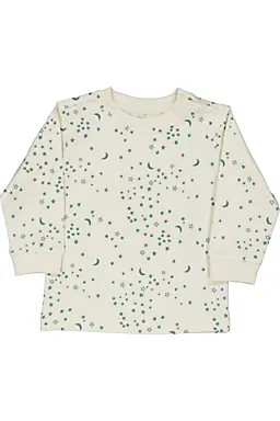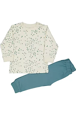 Deze baby pyjama heeft een licht shirt met een fijn patroon van kleine stipjes en maantjes, en een effen groene broek. De lange mouwen zorgen ervoor dat de armen goed bedekt blijven, zodat je baby warm blijft. Dankzij de zachte single jersey stof is het pyjamaatje soepel en comfortabel, waardoor je baby vrij kan bewegen tijdens het slapen of spelen.