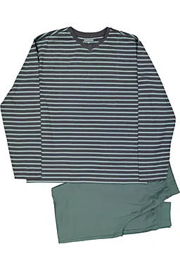 Deze herenpyjama bestaat uit een gestreept shirt met lange mouwen en een effen legergroene lange broek. Door de 100% katoenen stof voelt de pyjama zacht en ademend aan op je huid, zodat je comfortabel kunt slapen of ontspannen. De V-hals geeft een prettige pasvorm. De lichte en soepele single jersey zorgt ervoor dat je makkelijk beweegt.