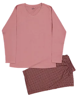 Deze damespyjama heeft een roze shirt met lange mouwen en V-hals. De broek is lang en heeft een subtiel patroon. Gemaakt van zachte single jersey van 100% katoen, wat prettig aanvoelt op de huid. De lange mouwen en broek zorgen voor extra warmte tijdens koelere nachten. Fijn om in te slapen of thuis comfortabel te ontspannen.