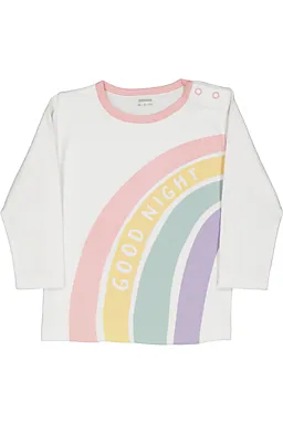 Deze roze babypyjama bestaat uit een top met lange mouwen en een broek. Op de top staat een grote regenboog in zachte kleuren met de tekst 'GOOD NIGHT'. De stof is zacht en de pasvorm comfortabel, zodat je baby makkelijk kan bewegen. Door de twee drukknoopjes op de schouder gaat aan- en uitdoen eenvoudig.