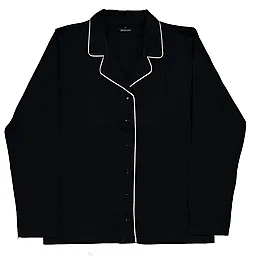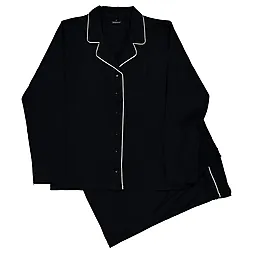 Deze zwarte damespyjama is gemaakt van 100% katoen. De stof voelt zacht aan en ademt goed, wat zorgt voor extra comfort. De pyjama heeft lange mouwen en een kraag met een subtiele bies. Het jasje is voorzien van een knoopsluiting, zodat je het gemakkelijk aan- en uittrekt. Ideaal om in te ontspannen of te slapen.