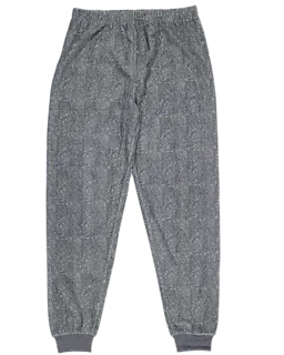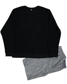 Deze herenpyjama bestaat uit een zwarte top met lange mouwen en een ronde hals, en een lange, licht gemêleerde broek met elastische taille. Dankzij de lange mouwen en boorden onderaan de broek blijft je lichaam goed bedekt, wat prettig is als het wat kouder is. De pyjama is gemaakt van 100% gerecycled polyester, zodat de stof soepel aanvoelt op je huid.