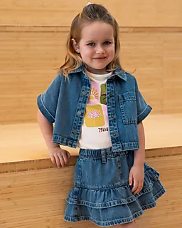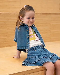 Deze blauwe denim rok voor meisjes heeft een elastische tailleband die meerekt, zodat je haar makkelijk aantrekt en hij prettig blijft zitten. De twee lagen met ruffles bewegen soepel mee, waardoor de rok luchtig valt. Het stevige katoen voelt prettig aan. De riemlusjes bieden extra mogelijkheden om de rok met een riem te dragen.