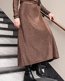 Deze lange rok voor dames is bruin van kleur en heeft een subtiele glans door het gebruik van metaaldraad in de stof. De rok is gemaakt van polyamide, metaaldraad en elastaan. Daardoor zit hij comfortabel en is hij licht rekbaar. Het eenvoudige ontwerp zonder knopen of zakken maakt deze rok makkelijk te combineren voor verschillende gelegenheden.