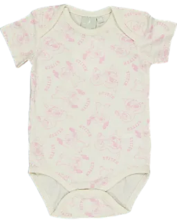 Deze beige romper voor baby's is gemaakt van zachte single jersey en heeft korte mouwen. De stof heeft een roze Stitch print. Door de envelophals trek je de romper makkelijk aan en uit. De drukknoopjes onderaan maken het verschonen makkelijk en snel.